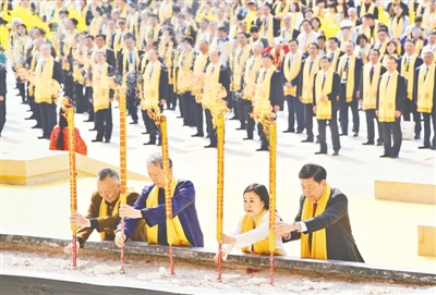 恭讀拜文。“粵稽遐古,天地洪荒,具茨綿綿,我祖是降……”王光謙登上拜祖臺,以全球華人之名,肅手恭頌。