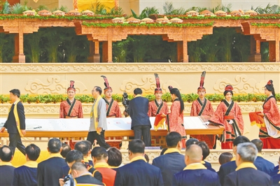 敬獻花籃。鐵凝、王光謙、樓陽生、王凱、張志軍、程學源、鄭平、閻京華,省委常委、鄭州市委書記安偉,鄭州市市長何雄,新鄭市委書記馬宏偉,新鄭市市長楊晉先后走上拜祖臺,向黃帝像敬獻花籃。