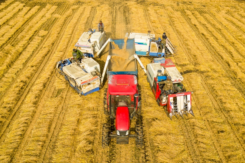 在黑龍江省綏化市北林區雙河鎮,村民駕駛收割機進行卸糧作業(2024年10月13日攝,無人機照片)。新華社記者 張濤 攝